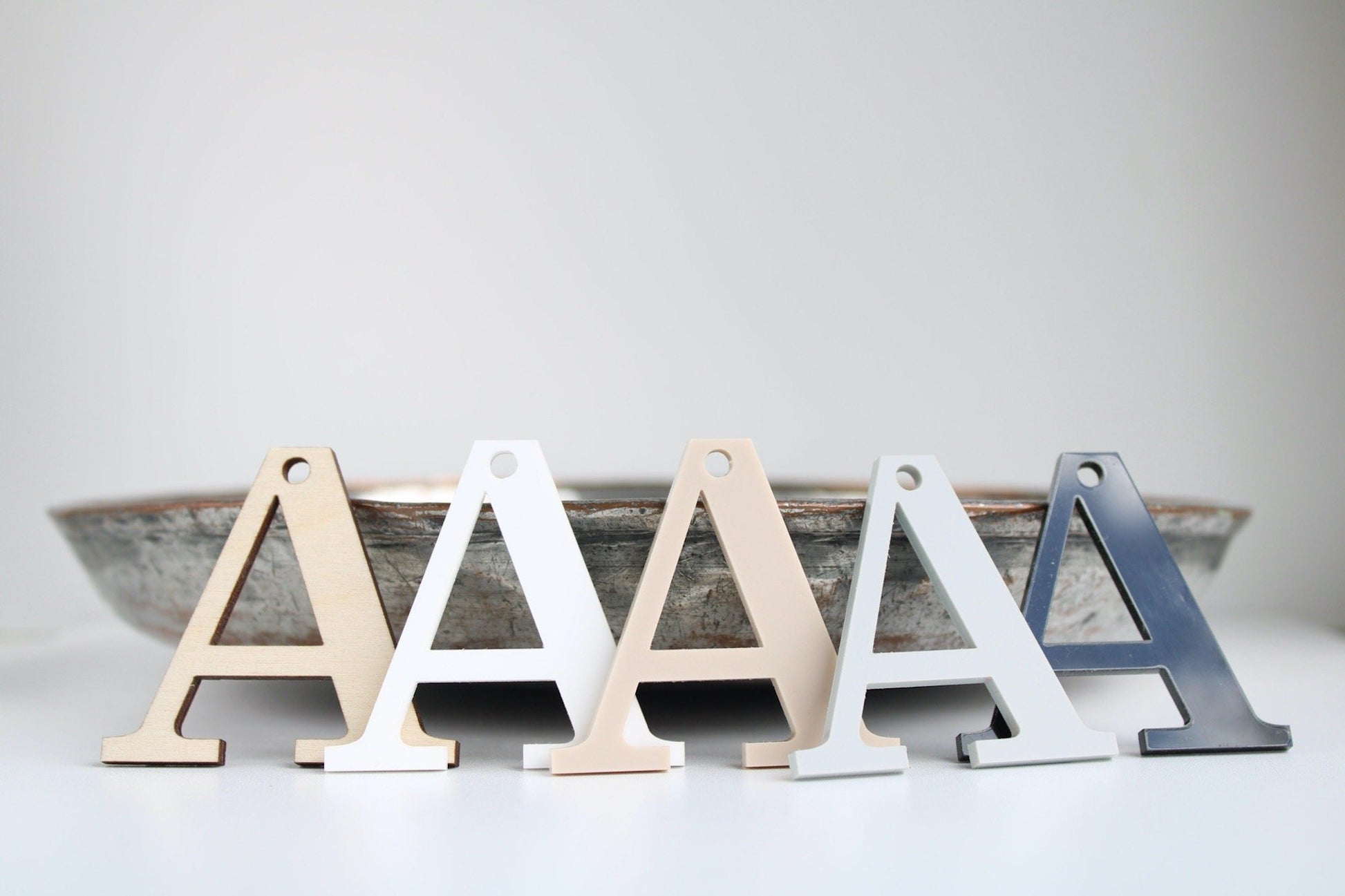 The tag measures 5cm (2 inches) high, width varies depending on the letter.